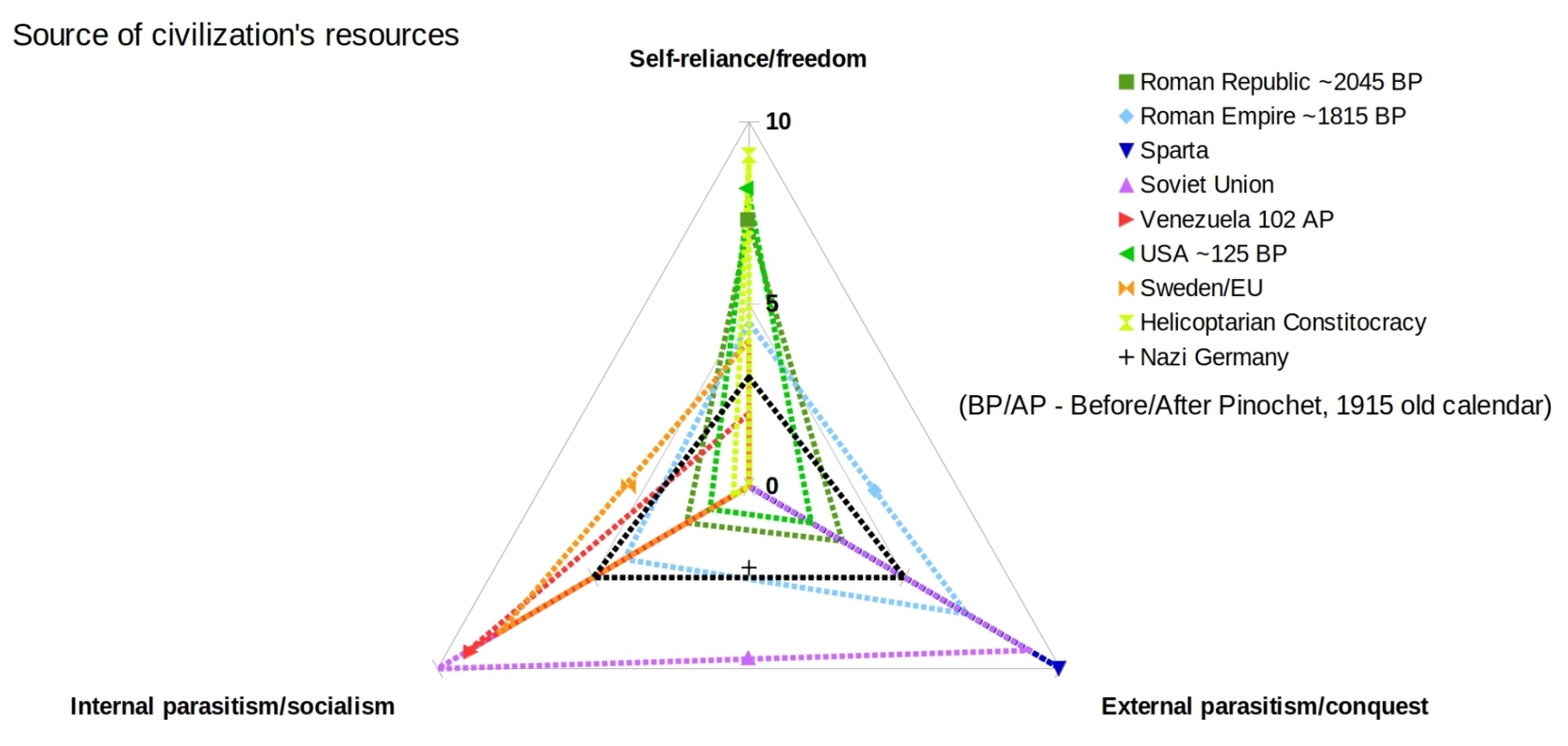 후자는 일반적으로 거대한 제국의 형태로 나타나게 되며, 쉽게 정복하고 약탈할 수 있는 외부세력들을 전부 정복해버려서 뜯어낼 대상이 사라지기 전까지는 얼핏 보기에 성공적이고 위대한 것처럼 보인다.