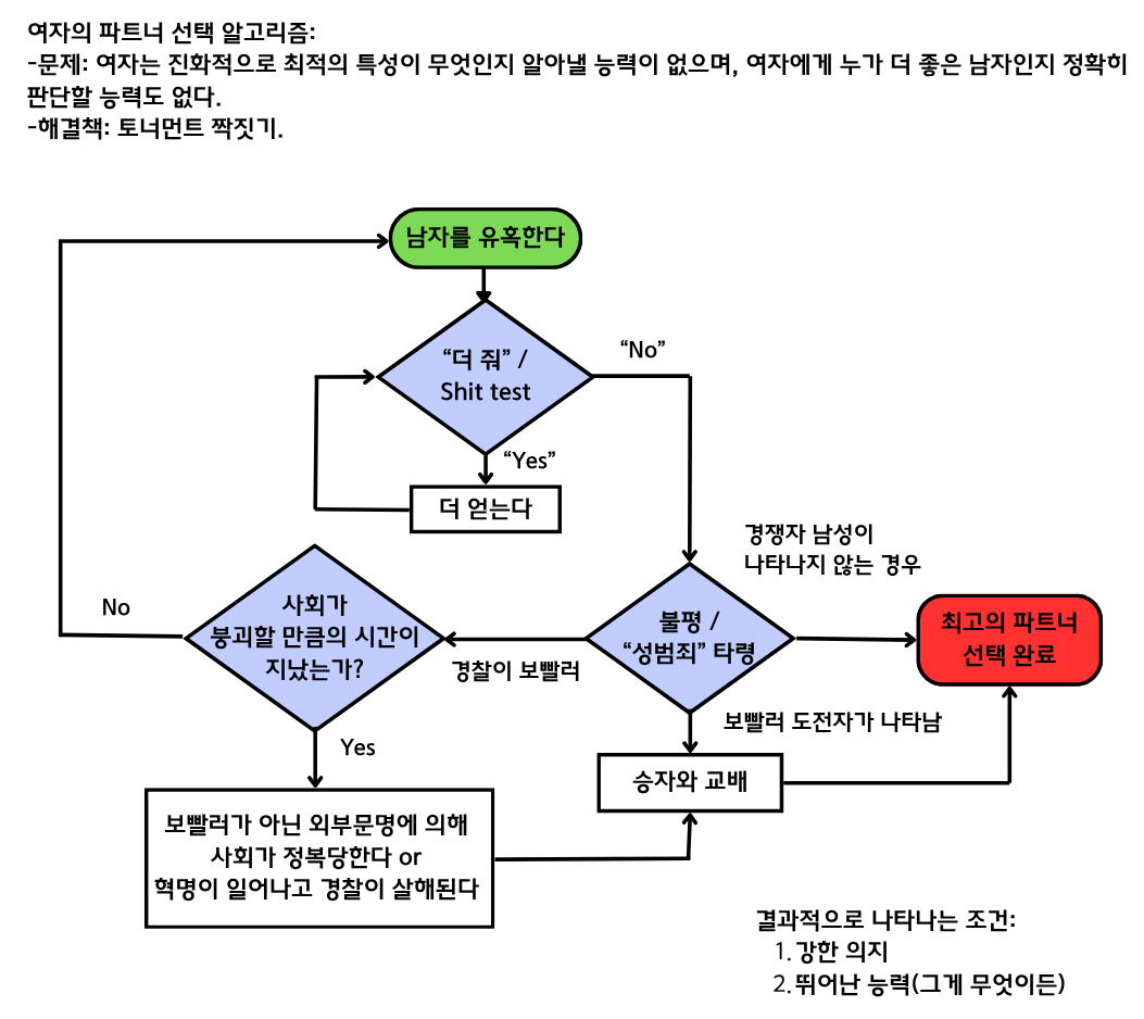 바로 그렇기 때문에 자연은 "토너먼트 짝짓기"를 통해, 그 어떤 조건이든 가리지 않고 전부 활용해서 최고의 짝을 선택하도록 만드는 것이다.